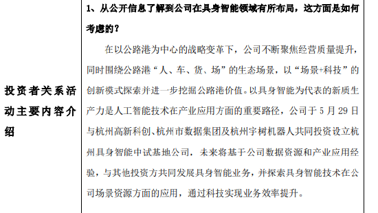 7月30日消息,传化智联在机构调研时表示,公司已与杭州高新(维权)科创、杭州市数据集团及杭州宇树机器人共同投资设立杭州具身智能中试基地公司,未来将基于公司数据资源和产业应用经验,与其他投资方共同发展具身智能业务,并探索具身智能技术在公司场景资源方面的应用,通过科技实现业务效率提升。