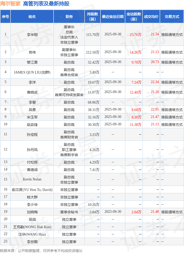 海尔智家的高管列表及最新持股情况如下: